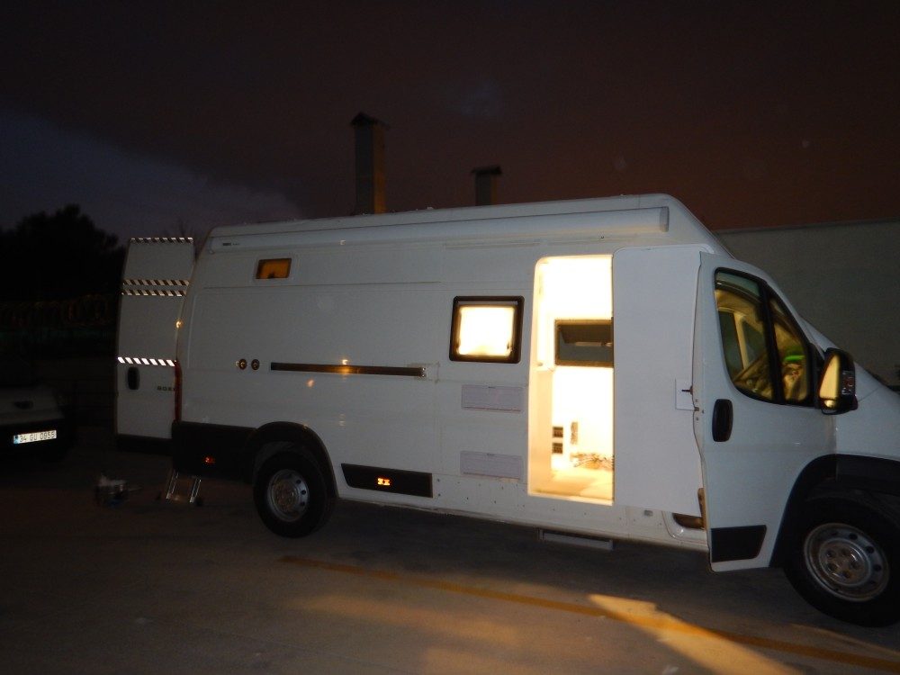 12V Led’leri bağladım artık geceleri de işe devam. 220v ile çalışacak aletlerin bağlantıları ve sigortaları tamam. Tavan hekilerinin fanlarını bağladım. Test yaptığım 12v 6amperlik akünün şarjı yokmuş anca 2dk. çalıştırdı (serinlik haram bana).