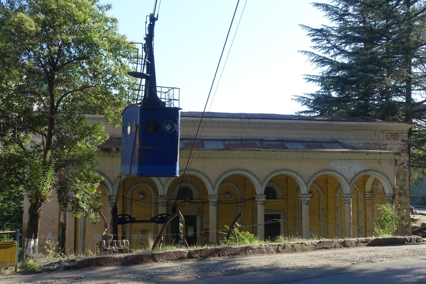 Teleferiğin ana istasyonunu. Duvarında çakıl taşları ile yapılmış Lenin ve Stalin portresi var.