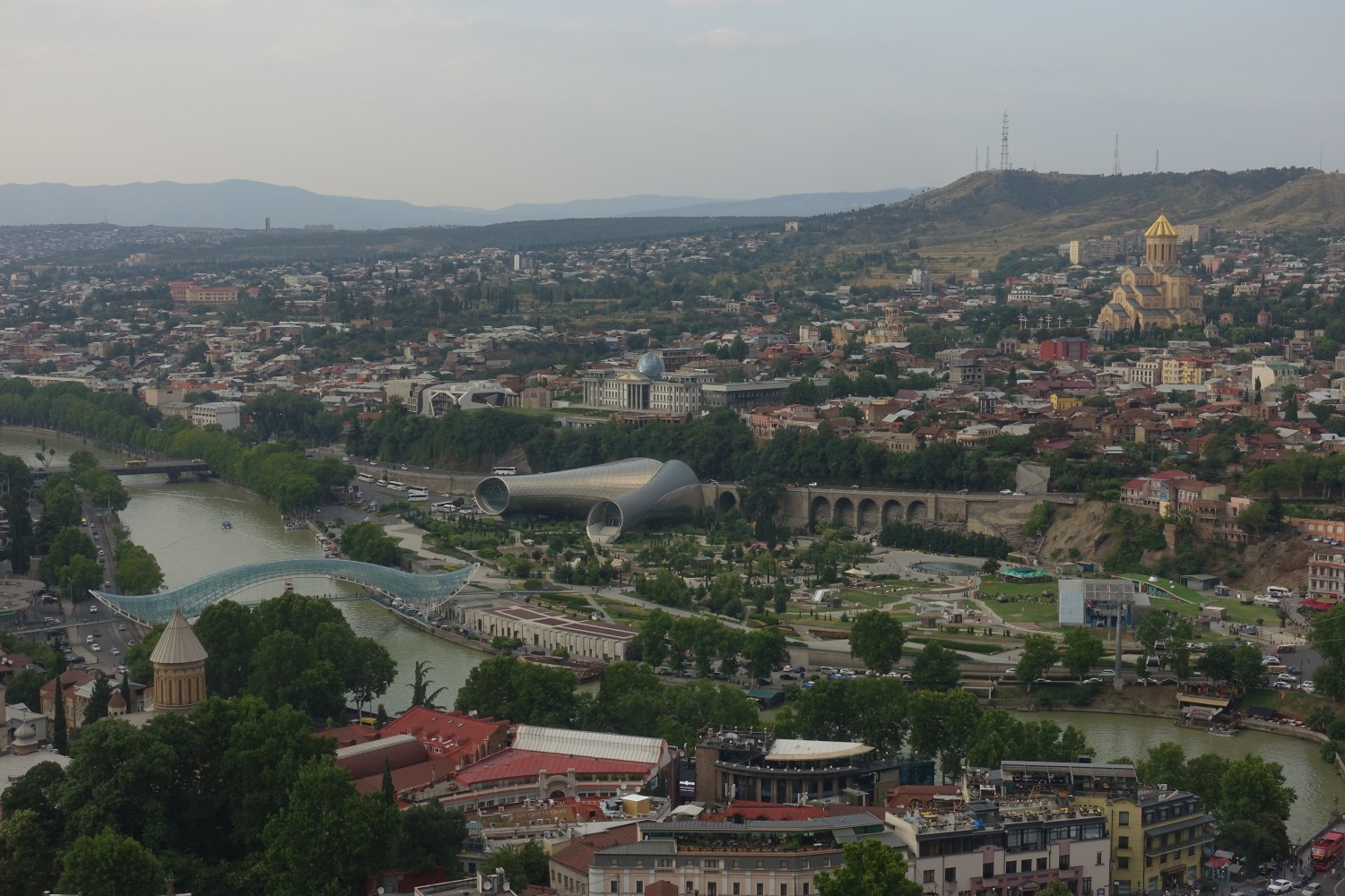 Sağda uzakta Sameba Katedrali. Ortada iki tünel şeklindeki yapı, yeni opera binası. Solda Kura nehrinin üzeride tüp şeklinde olan köprü Barış Köprüsü.